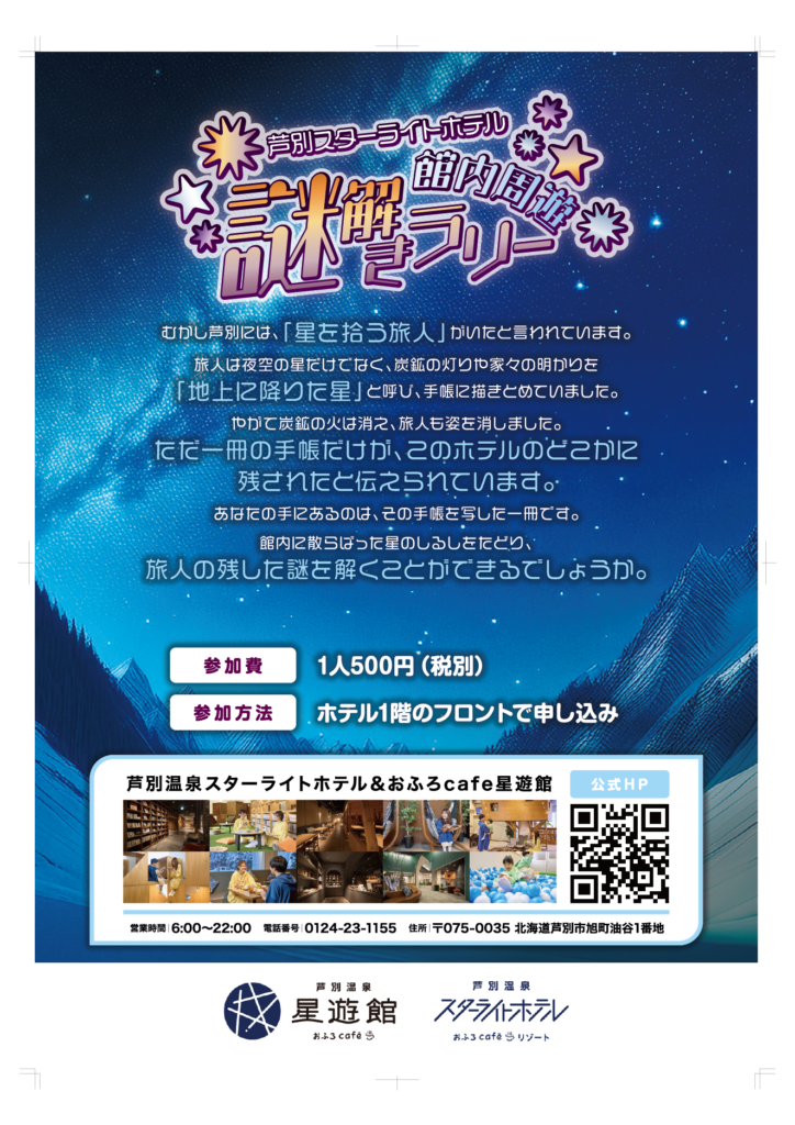 芦別温泉スターライトホテル&おふろcafé星遊館では、館内をめぐりながらお楽しみいただける 「館内周遊謎解きラリー」 を開催いたします。ホテルの中に散りばめられた手がかりを集め、謎を解き明かしながらゴールを目指す体験型イベントです。